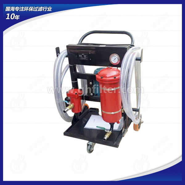 手推式滤油小车又叫便移式滤油机、液压油滤油机、滤油小车、精细滤油车,新乡市国海滤器生产制造的滤油车可以作为液压系统和润滑系统中与各类用油设备的油液作灌注或定期过滤。手推式滤油小车对节油与回收脏油具有一定的经济效果。手推车型,体积小,移动方便,结构坚固耐用,可以很方便地移动至液压设备旁边向液压系统注油并同时进行过滤,也可周期性的对液压系统油液进行外循环过滤。